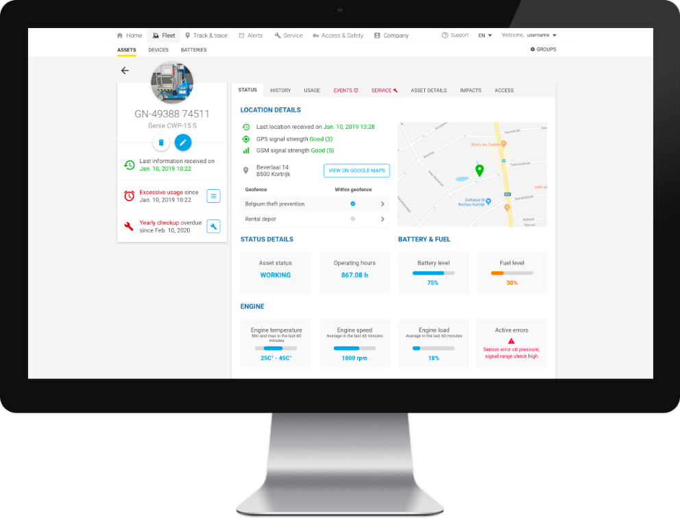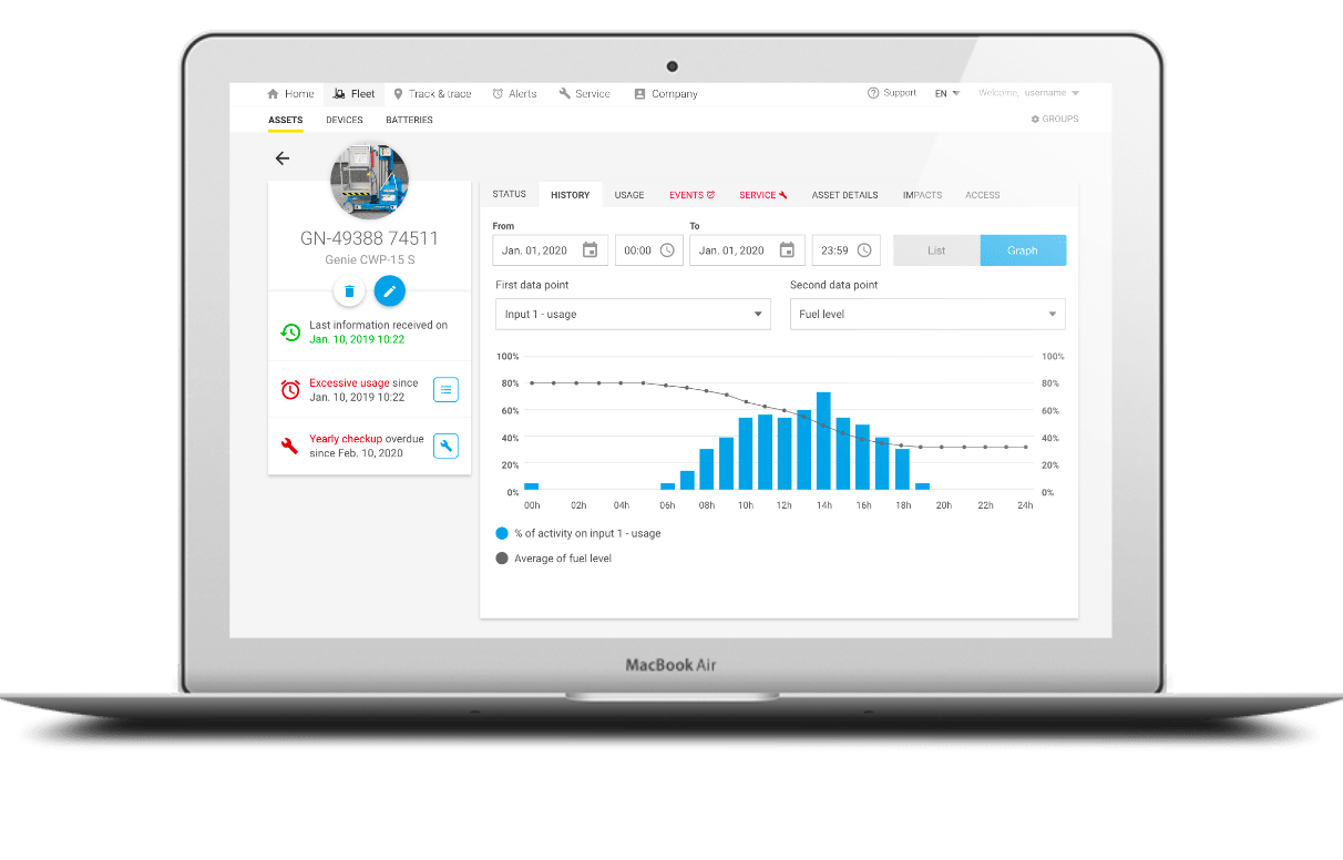 Gem One le permite personalizar su dispositivo telemático según sus necesidades. Puede supervisar su equipo, el operador, cuándo está prevista la mantenimiento, etc., y beneficiarse de datos en tiempo real para obtener estadísticas precisas.